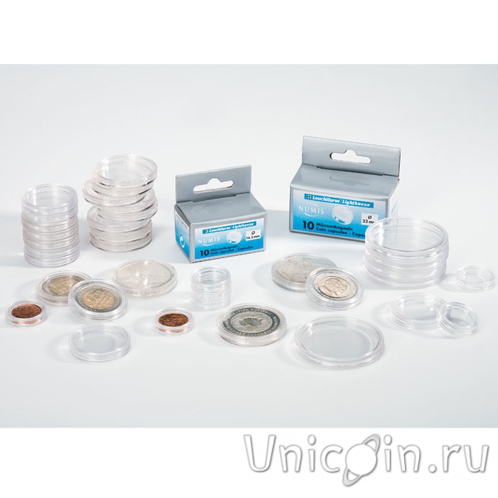 Капсулы для монет 24 мм. Внешний диаметр 30 мм. Упаковка - 10 штук. Производство Leuchtturm, Германия. Идеально подходит для длительного хранения монет. Подходит для монет: 25 центов США (квотер), 1 DM.