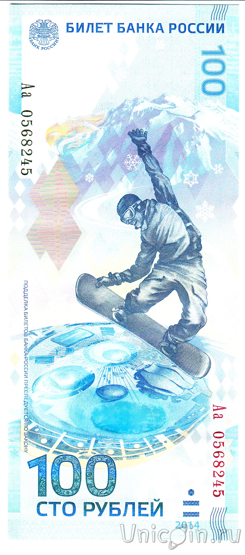 Россия 100 рублей 2014 Сноубордист, Сочи
