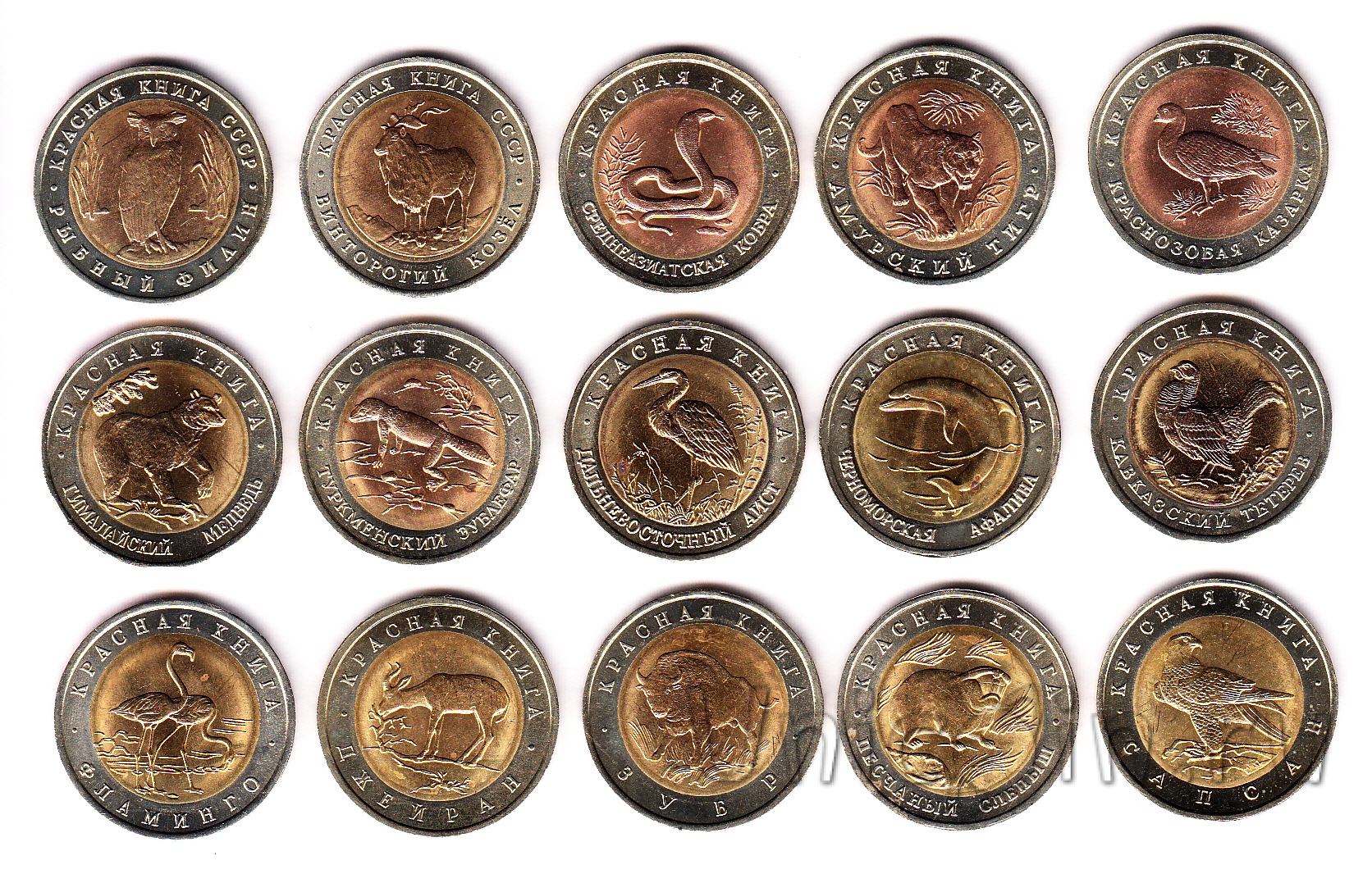 Россия-СССР набор 15 монет 1991-1994 гг. "Красная книга"