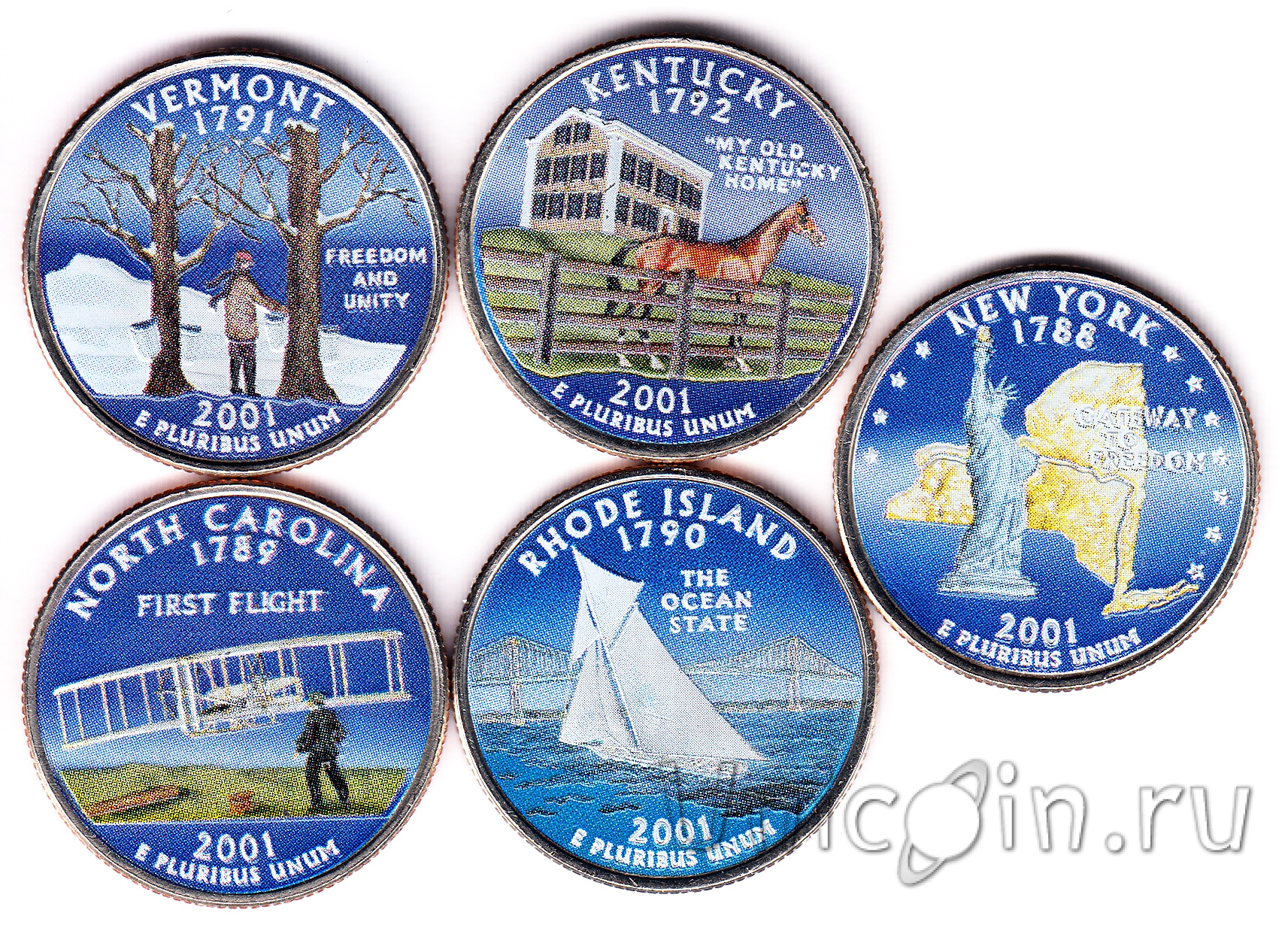 США 25 центов 2001 г. Штаты (5 штук, цветные)