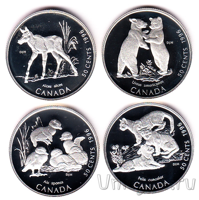 Канада набор 4 монеты 50 центов 1996 г. Зверята: медвежата, утята, лосенок и дикие кошки. Вес каждой монеты 11.66 г.
