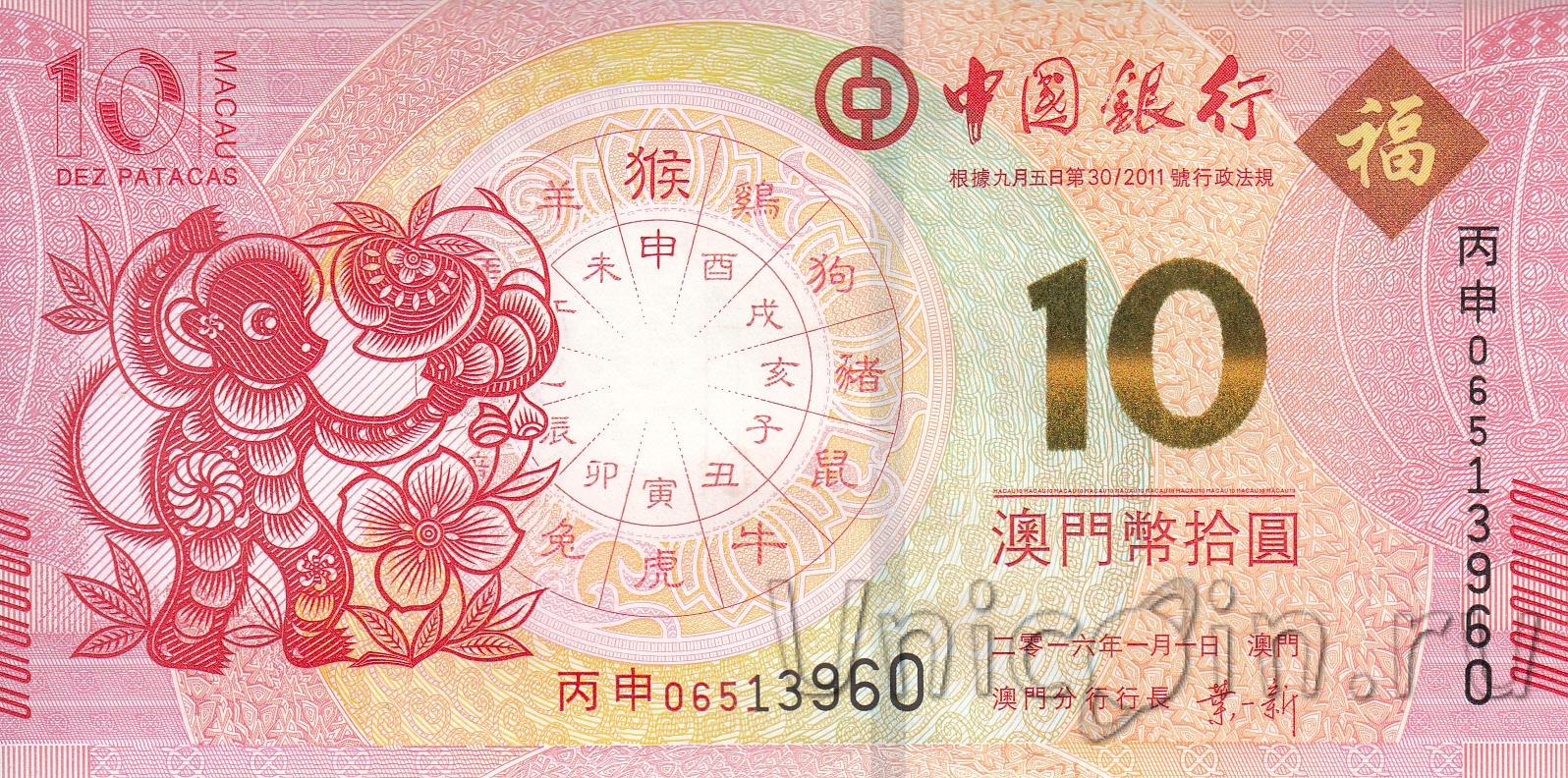 Макао 10 патак 2016 г. Год обезьяны (Bank of China)