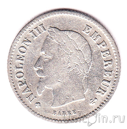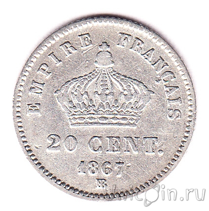 Франция 20 сантимов 1867 г. Отметка монетного двора: "BB" - Страсбург