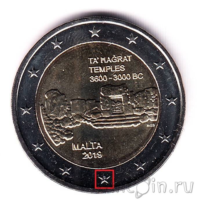 Мальта 2 евро 2019 Храм Хаджрат (с буквой F в звезде)