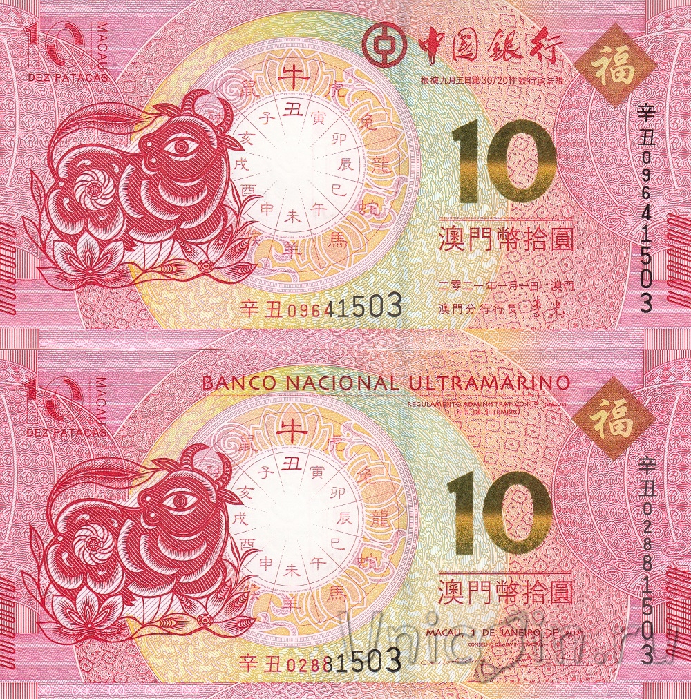 Макао 10 патак 2021 Год быка (Banko Nacional Ultramarino + Bank of China)
