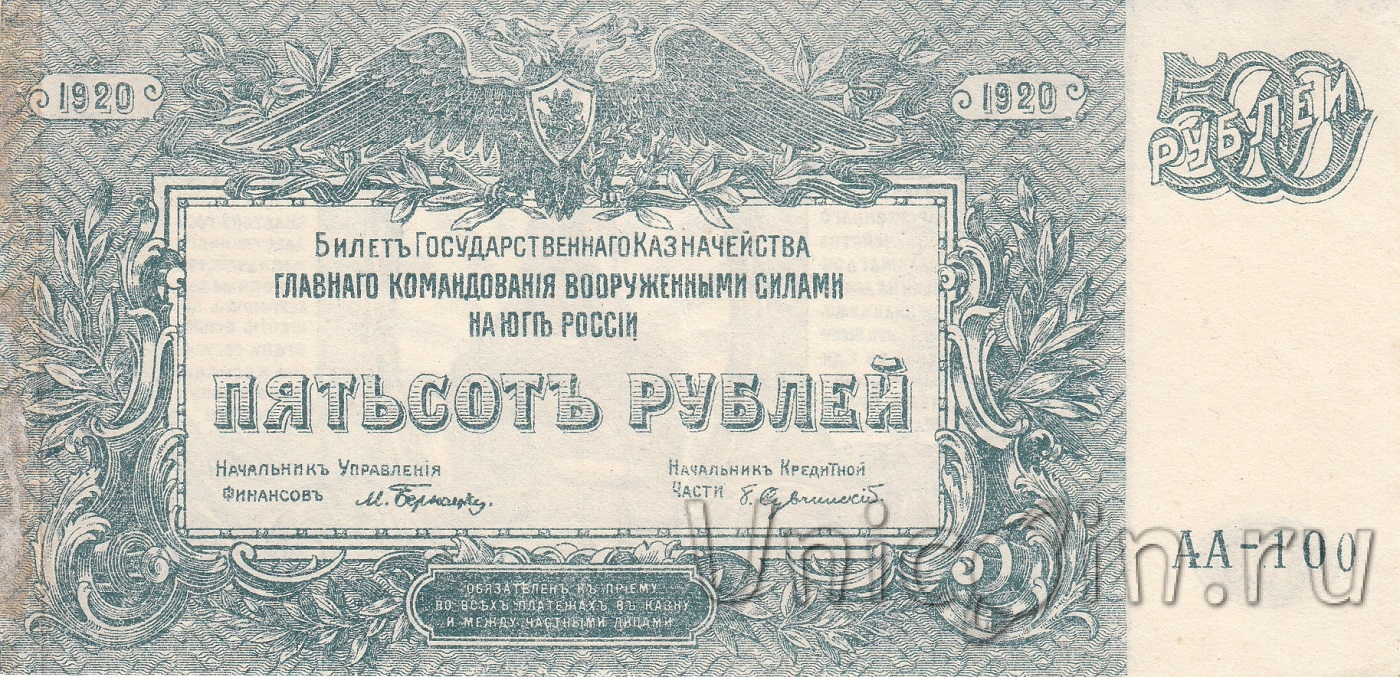 Главное командование вооруженными силами на Юге России 500 рублей 1920