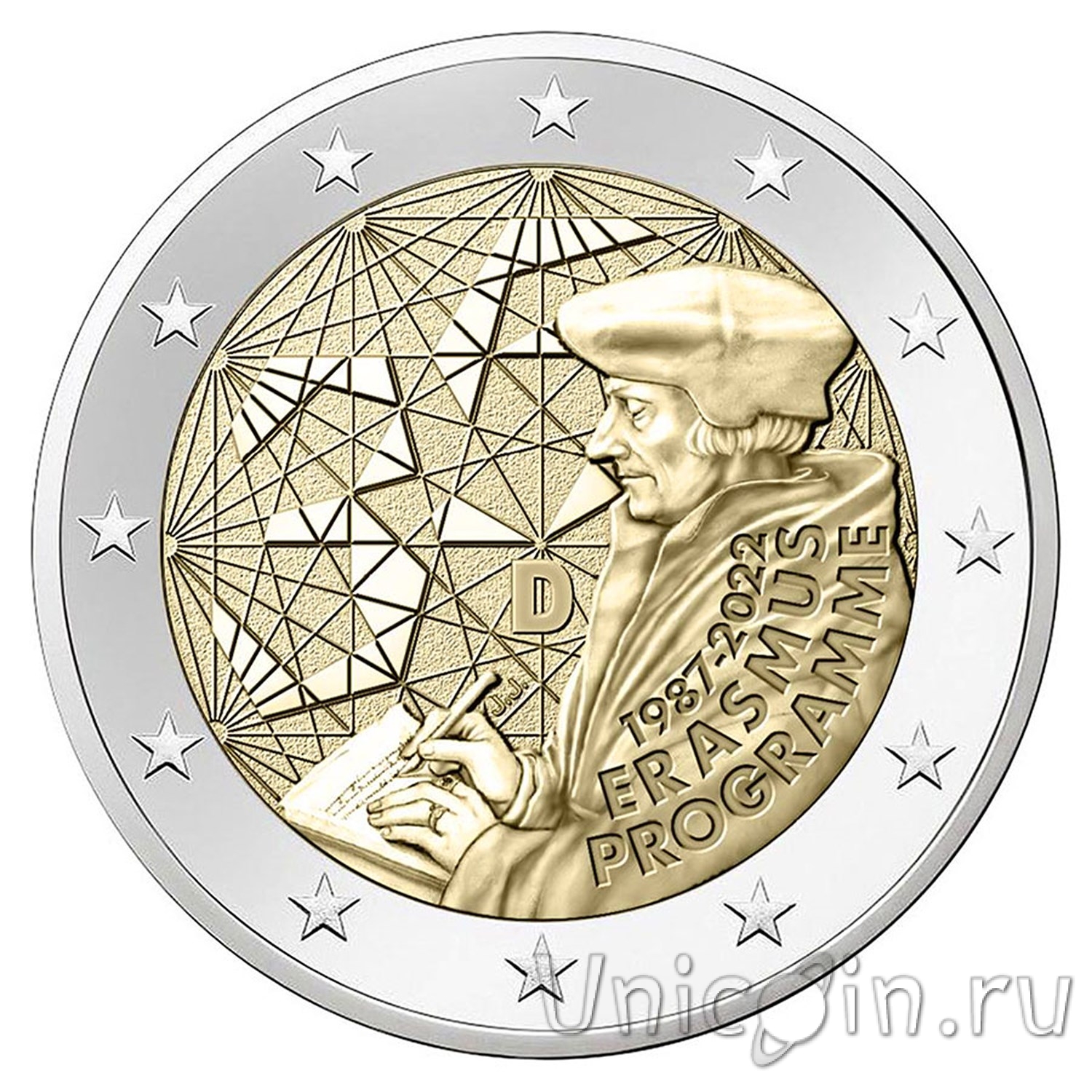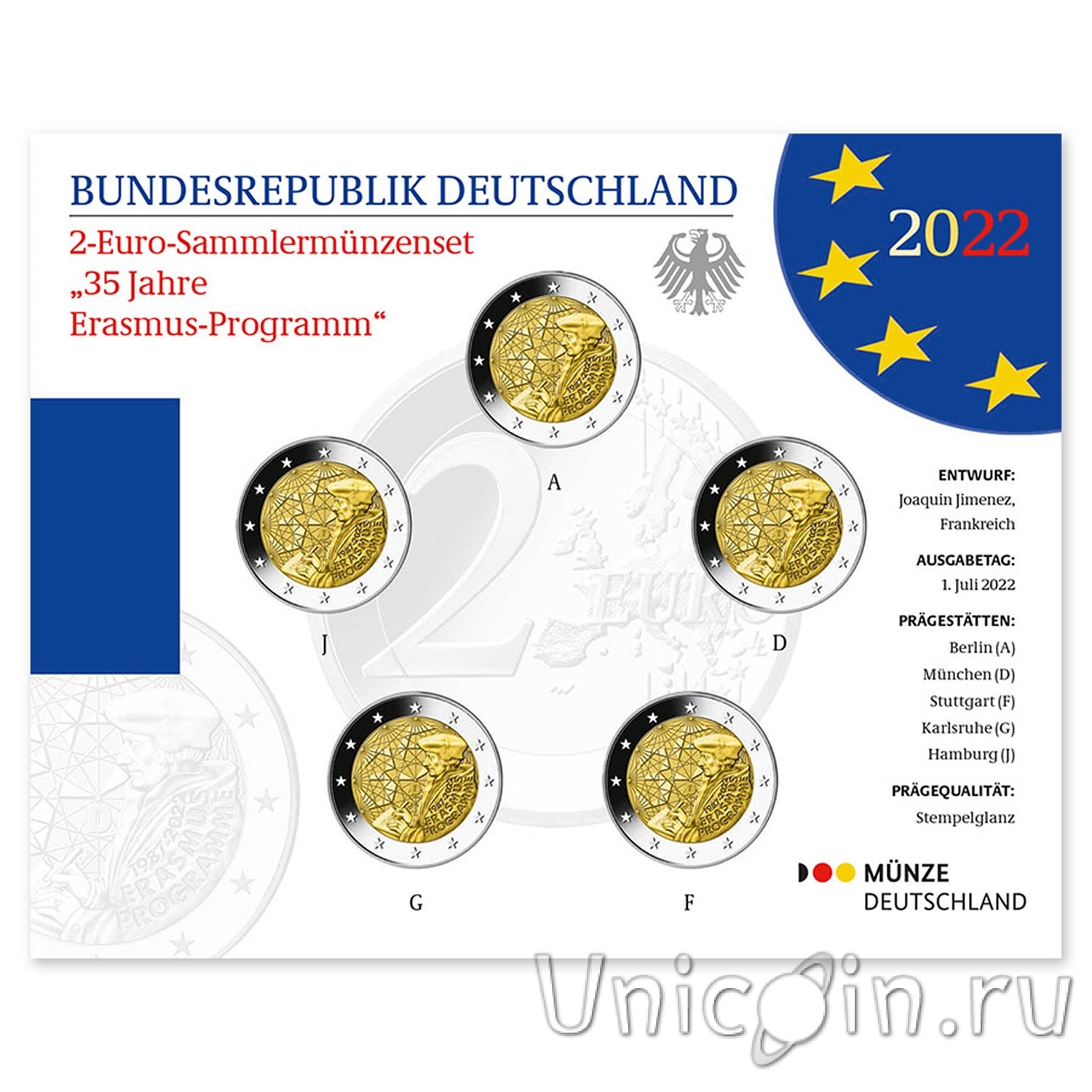 Германия 2 евро 2022 35 лет программе Эразмус (все пять монетных дворов, в буклете)