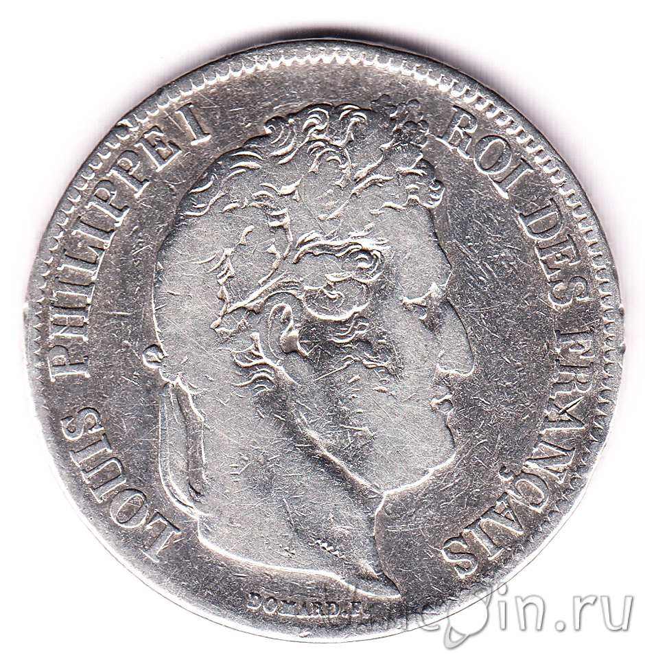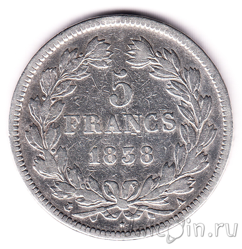 Франция 5 франков 1838 г. Отметка монетного двора: "A" - Париж