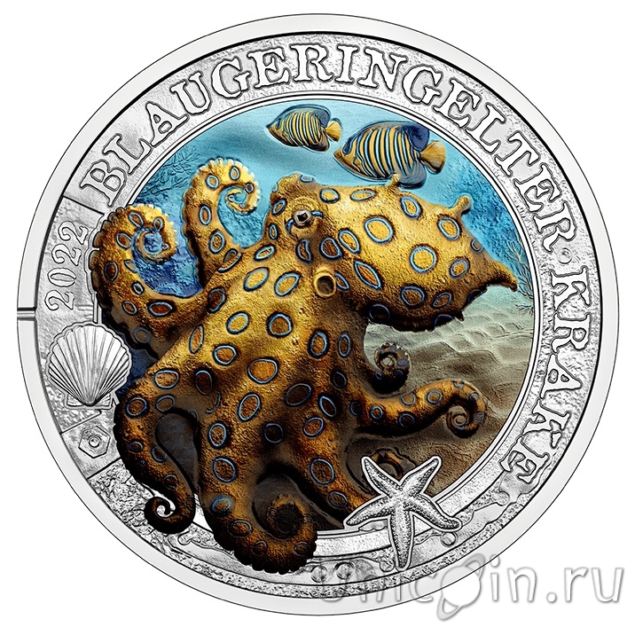Австрия 3 евро 2022 г. Осьминог - первая монета новой серии "Морские обитатели"