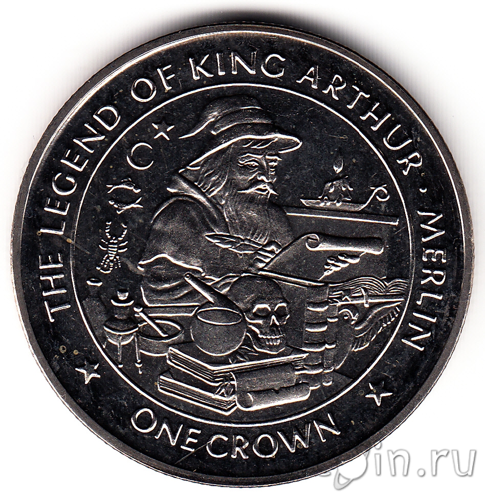 Остров Мэн 1 крона 1996 г. Легенда о короле Артуре. Мерлин — в британском цикле легенд, мудрец и волшебник кельтских мифов, наставник и советник короля Артура, а до того и его отца Утера; а ранее — короля Вортигерна. Кроме того имя Мерлина встречается как эпитет в средневековой кельтской поэзии бардов.