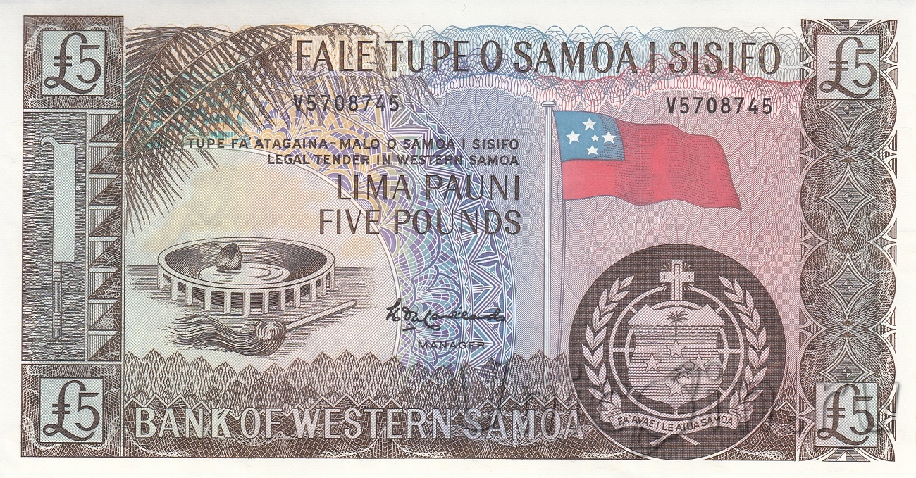 Западное Самоа 5 тала 1963 г. Официальный репринт 2020 - есть префикс перед номером.