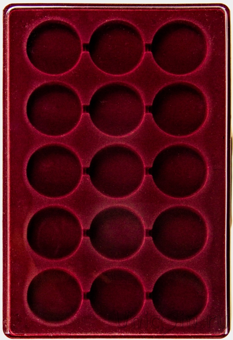 Планшет на 15 круглых ячеек с прозрачной пластиковой крышкой. Планшет имеет твердое основание из красного пластика. Материал отделки: Бархат (Флок), цвет - Бордовый.