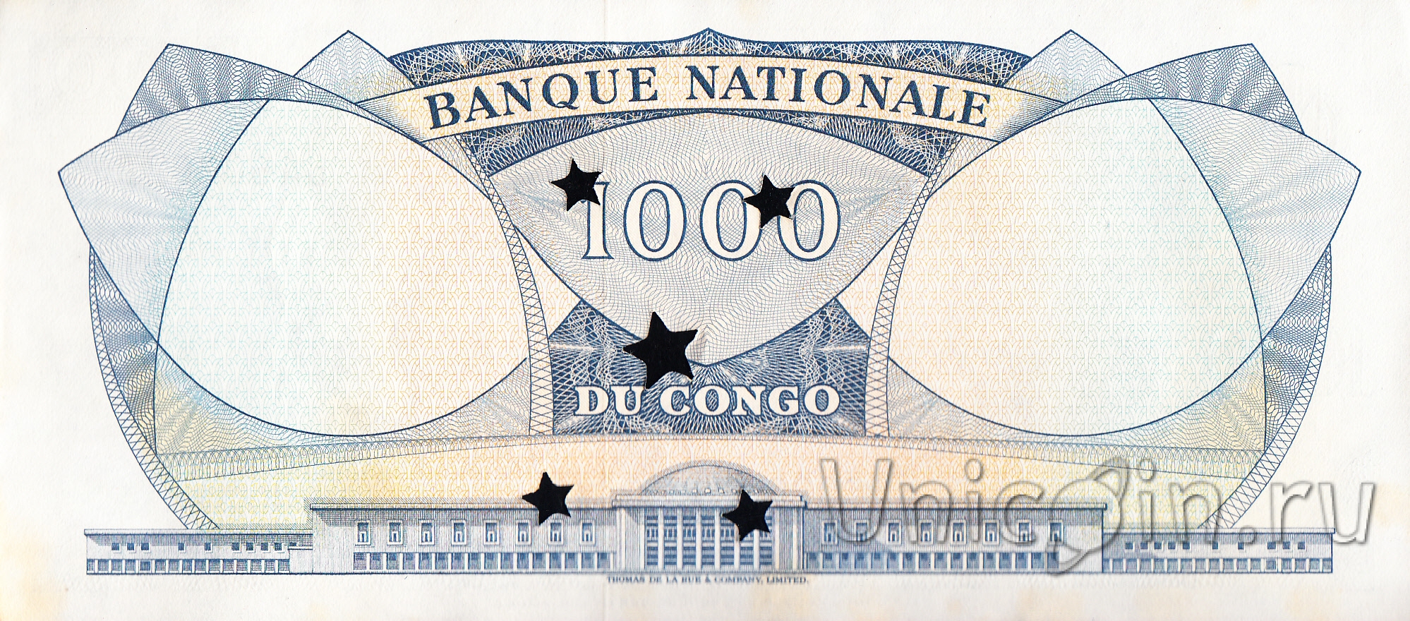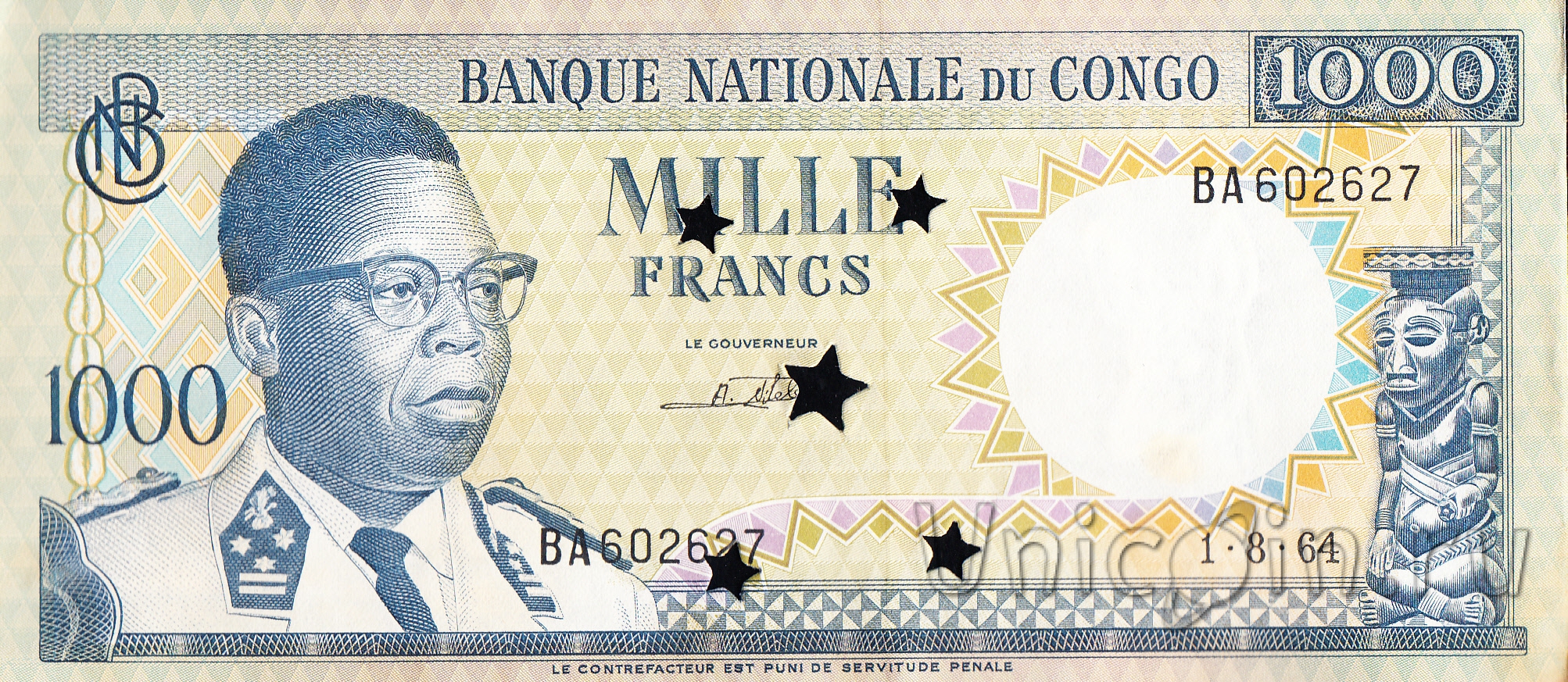 ДР Конго 1000 франков 1964 г. С перфорацией.
