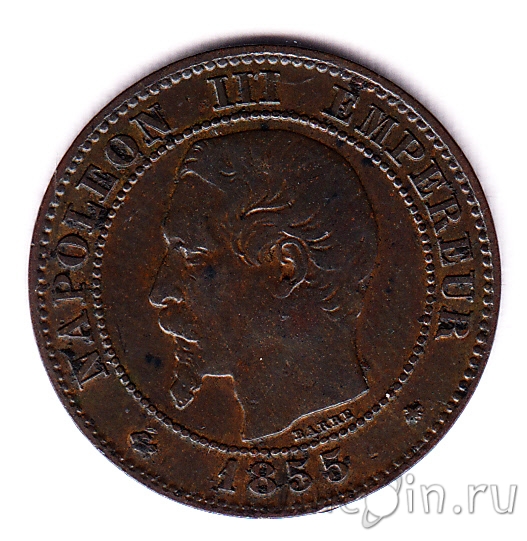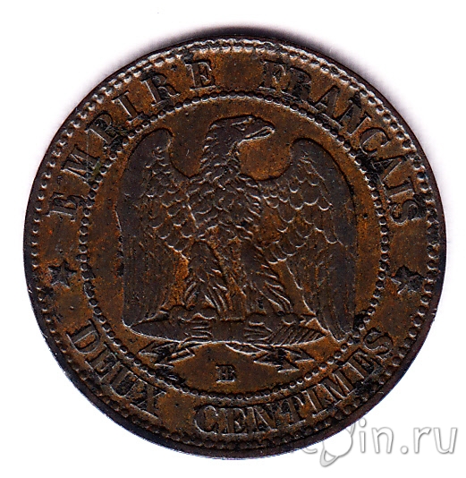 Франция 2 сантима 1855 г. Отметка монетного двора: "BB" и "якорь" - Страсбург