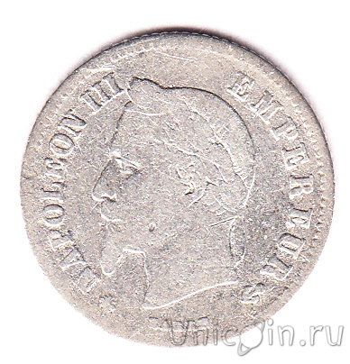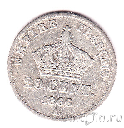 Франция 20 сантимов 1866 г. Отметка монетного двора: "A" - Париж