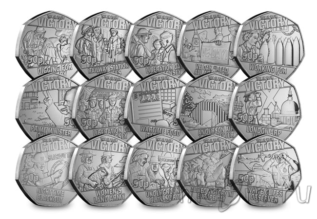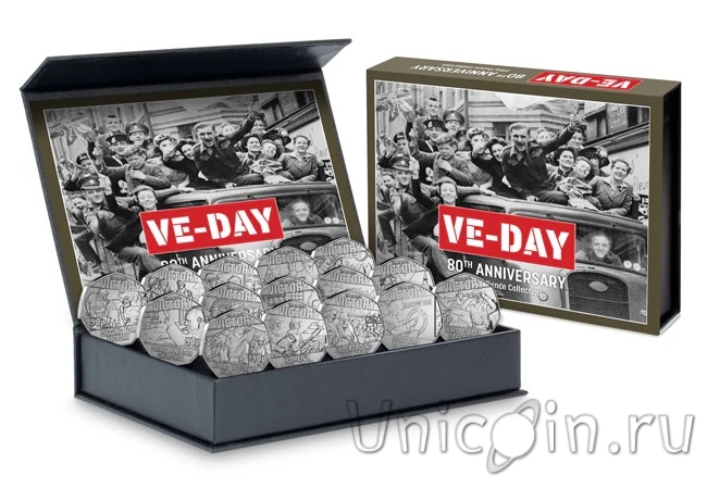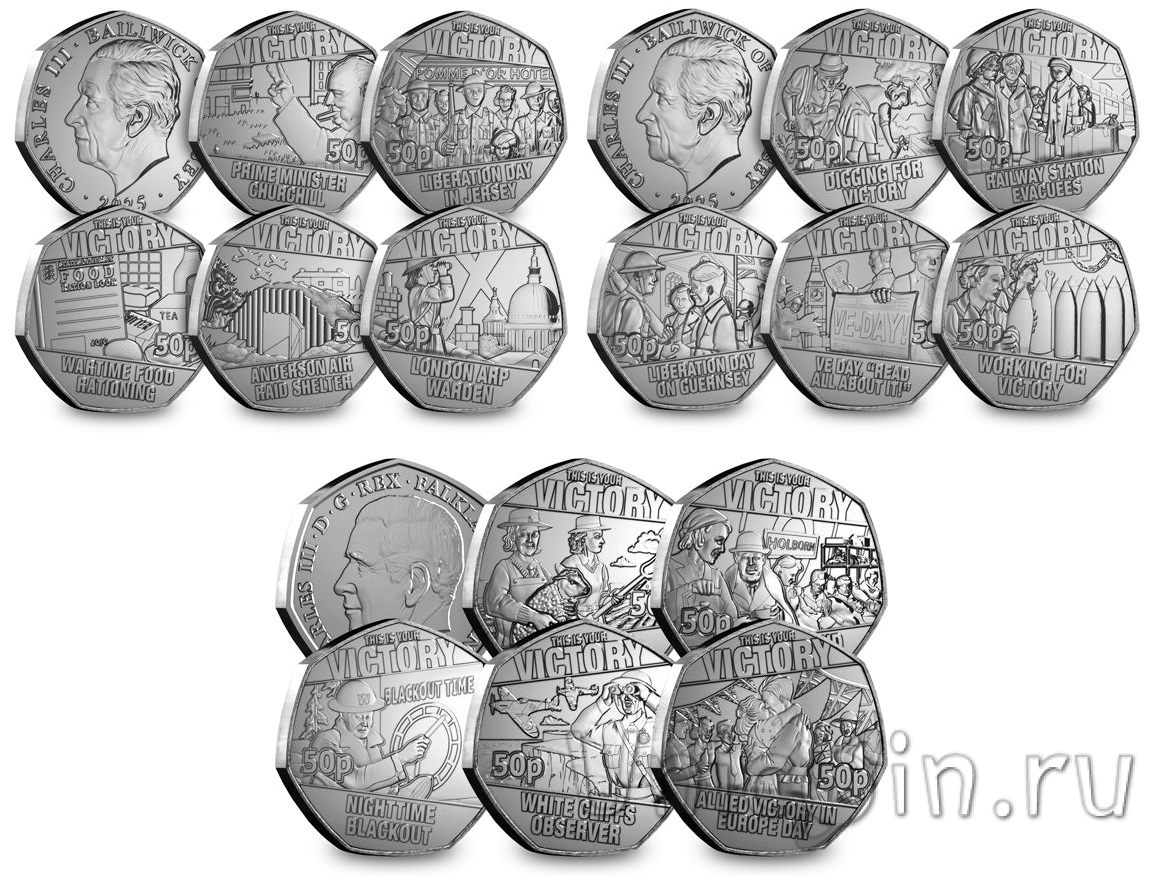 Набор из 15 монет: остров Мэн, Джерси и Гернси - 80 лет со дня Победы в Европе