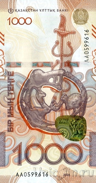 Оборотная сторона: cобаки породы Тобет и Тазы на фоне стилизованного орнаментом щита; – круговой казахский орнамент, олицетворяющий «щит» – символ защиты ценностей, древний символ – четыре стороны света, солярный знак в центре как символ созидательной энергии и жизни. Также на оборотной стороне банкноты изображен артефакт – подпружная бляха в виде свернувшегося хищника как символ единения с природой и гармонии.