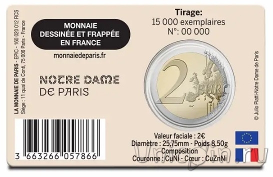 Франция 2 евро 2025 Нотр-Дам де Пари (в буклете)